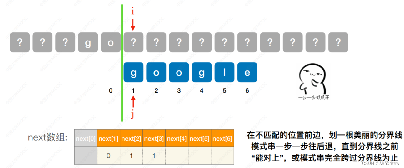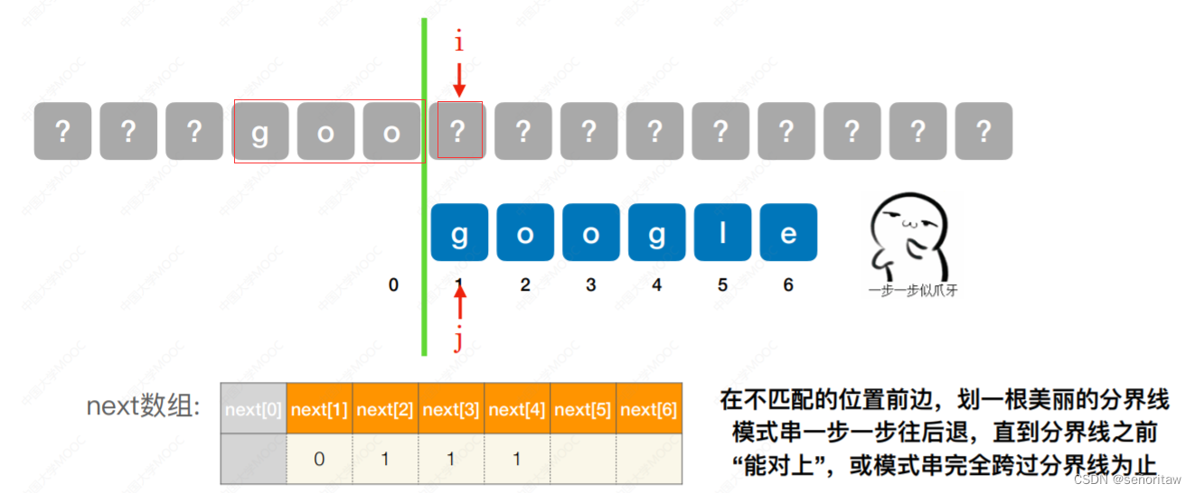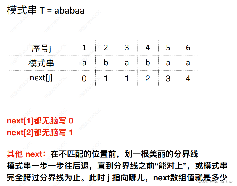 任何模式串第1个字符不匹配时,只能匹配下1个⼦串,因此,next[1]都⽆脑写 0 第2个字符不匹配时,应尝试匹配模式串的第1个字符, 因此,next[2]都⽆脑写 1 接下来的字符,在不匹配的位置前划一根分界线,模式串一步一步往后退,直到分界线前的“对的上”,或模式串完全越过分界线位置,如下面为第3个字符不匹配的情况