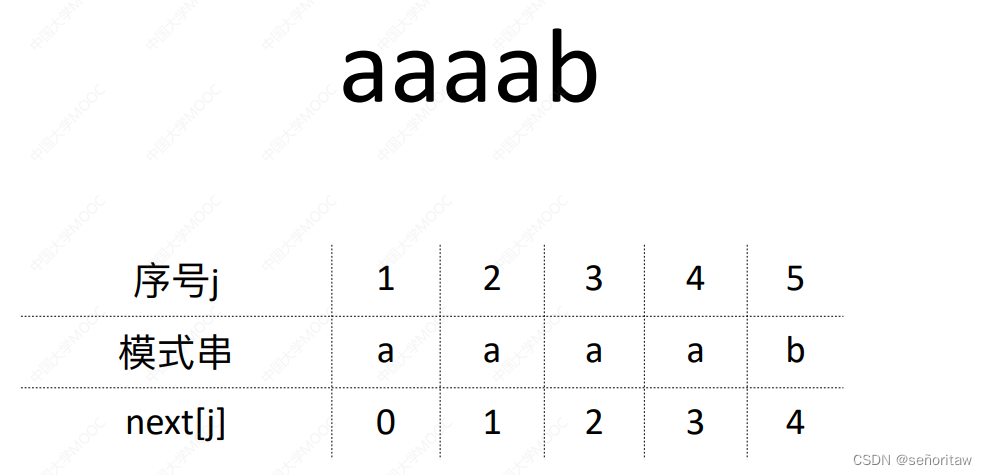 第3个字符和第1个字符相同,所以 可以直接跳到next[1]指向的位置,第5个字符跟第2个字符相同,直接跳到next[2]指向的位置