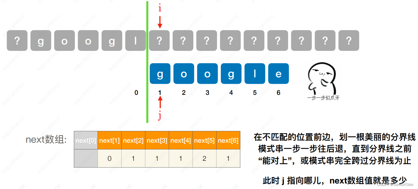 当模式串的第 j 个字符失配时,从模式串的第 next[j] 的继续往后匹配