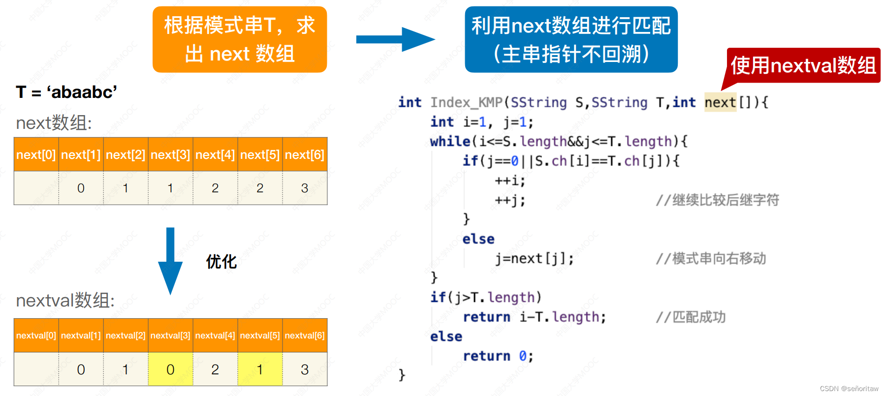 KMP算法精髓:利用已经匹配过的模式串的信息,求出next数组→利用next数组进行匹配(主串指针不回溯)